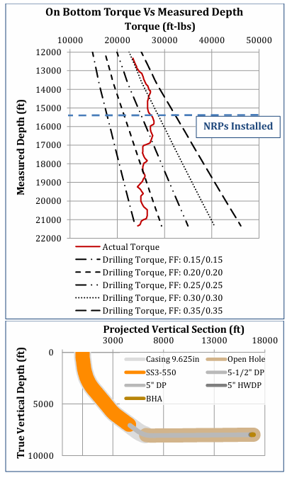 While Drilling NRPs were installed while drilling and covered the area from surface to 6,084ft at TD with one NRP per joint. As NRPs ran in hole, the torque stabilized at 25,000 ft-lbs. Models predicted torque would have increased to 40,000 ft-lbs without NRPs.
