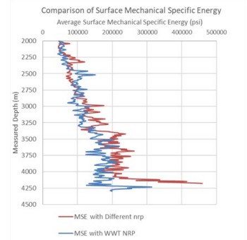 High MSE values averaging around 1500 psi were recorded on a first drilling run without WWT NRPs. A significant drop in MSE was recorded when WWT NRPs were used on the second run, averaging around 500 psi throughout the run.